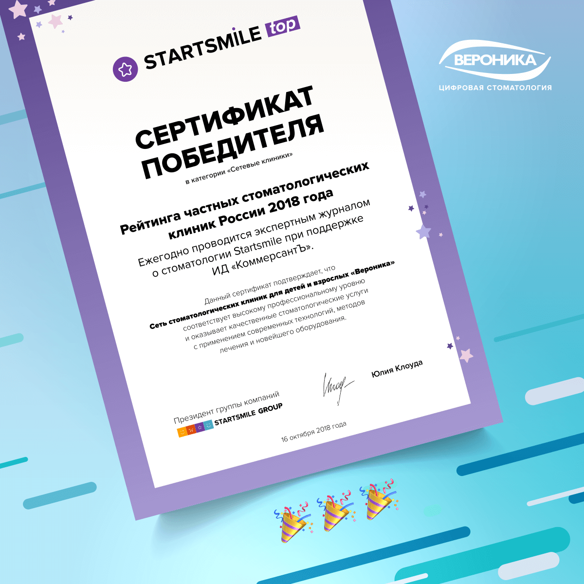 Экспертный журнал Startsmile и ИД «Коммерсантъ» опубликовали шестой ежегодный профессиональный рейтинг стоматологических клиник России-2018. Сеть «Вероника» вновь стала первой по Санкт-Петербургу и второй по всей стране (в прошлом году мы были на третьей позиции).