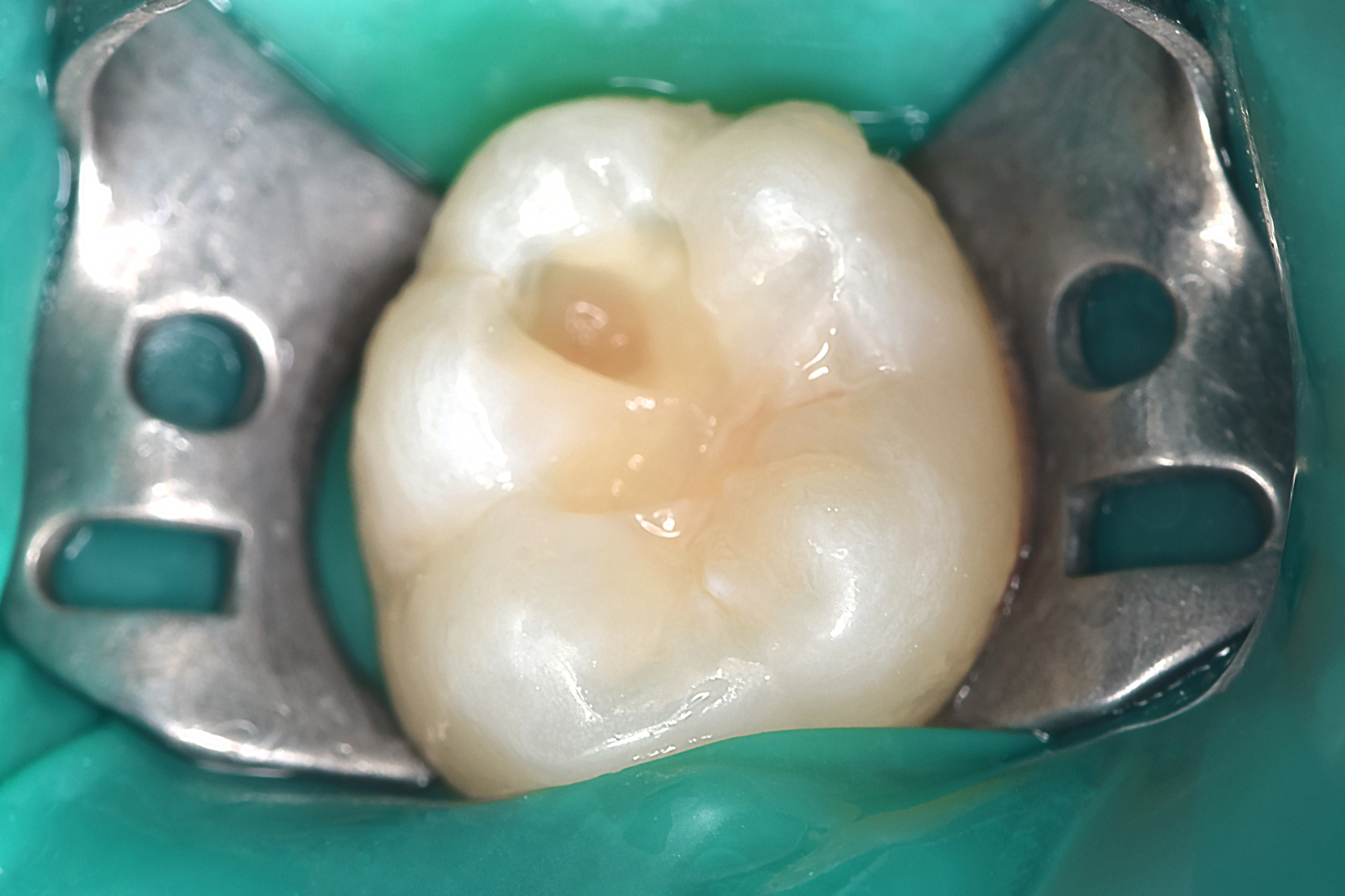 Произведено лечение среднего кариеса, зуб восстановлен пломбировочным материалом